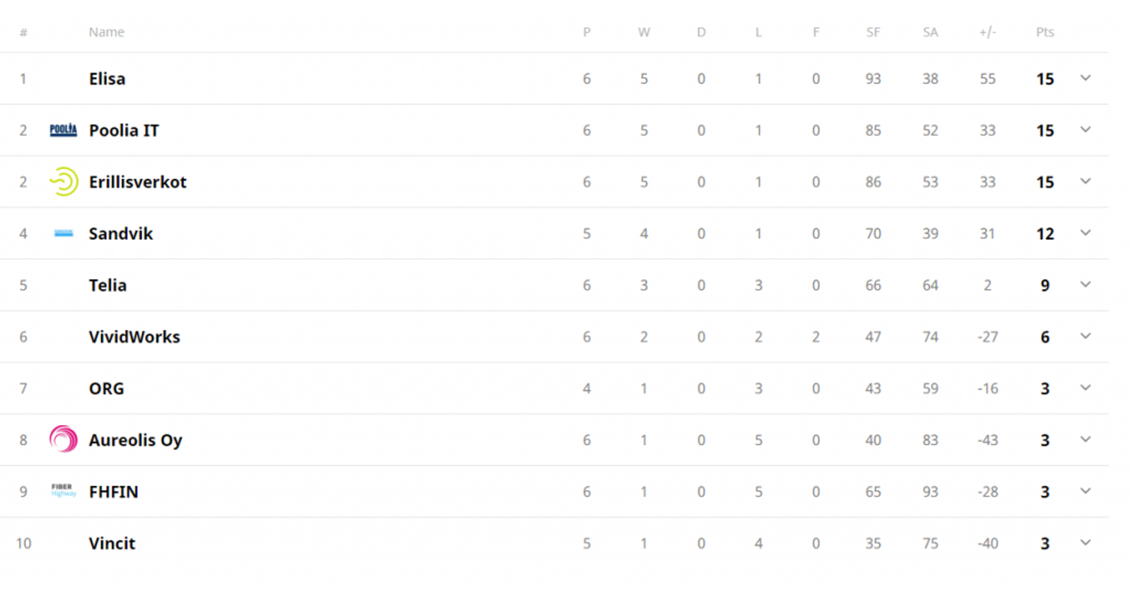 Another tie can be found at the Pro league level. Also in Pro, every team has had to bow out at least once, but Elisa's supportive leadership is thanks to a convincing runiration. Poolia IT and Erillisverkot are tied, both have lost once (to Elisa) and the runs are tied (33). According to rumors, these friends/enemies/etc will be meeting next Sunday, but the exact time has yet to be decided. Sandvik is after one match and one victory, Telia is still competing for the next place.
