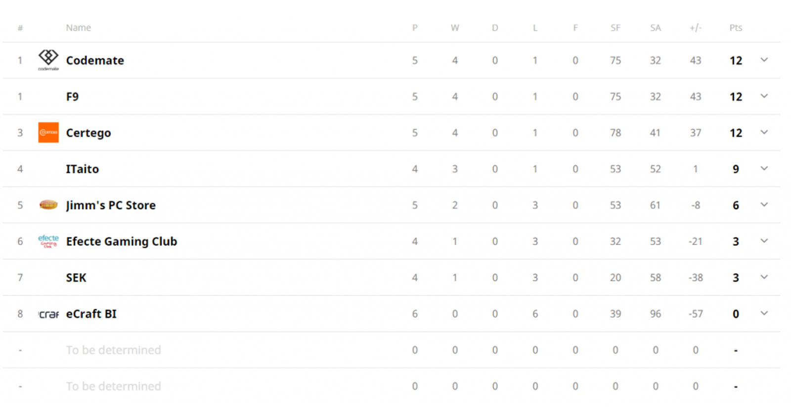 In Semipro, it's tighter between the top tier - the three top teams are tied on four wins out of five. The top spot is shared between Codemate and F9, because the rune ratio is also the same 43. So every rune won can be decisive! So it's no surprise that a battle between these two is the highlight of this week's SemiPro. The game will be played next Thursday 28.3. at 20. And as already stated, the streams can be found on our Discord stream channel.